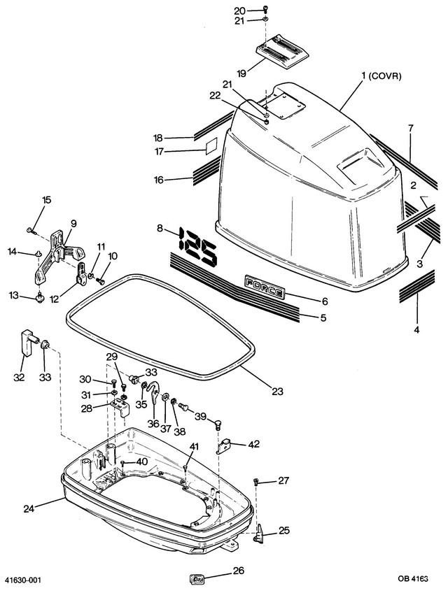 | 1 | ENGINE COVER (WITHOUT PAINT, DECALS OR HARDWARE) Деталей в узле: 1 цена по запросу 2 | Art.: F663894 DECAL, TOP - FRONT Деталей в узле: 1 снято с производства 3 | Art.: F663397 DECAL, BOTTOM - PORT Деталей в узле: 1 снято с производства 4 | Art.: F663892 DECAL, BOTTOM - FRONT Деталей в узле: 1 снято с производства 5 | Art.: F663396 DECAL, BOTTOM - STARBOARD Деталей в узле: 1 снято с производства 6 | Art.: MEDALLION - FORCE Деталей в узле: 2 цена по запросу 7 | Art.: F663373 DECAL, TOP - SIDE Деталей в узле: 2 снято с производства 8 | Art.: F664386 DECAL, NUMBER 125 Деталей в узле: 2 снято с производства 9 | Art.: BRACKET, ENGINE COVER LATCH Деталей в узле: 1 цена по запросу 10 | Art.: HEX CAP SCREW, 5/16 - 18 X 5/8 Деталей в узле: 2 цена по запросу 11 | Art.: SPRING LOCKWASHER Деталей в узле: 2 цена по запросу 12 | BRACKET, ROLLER LATCH W/ROLLER Деталей в узле: 1 13 | Art.: F481434 GUIDE, ENGINE COVER Деталей в узле: 2 14 | Art.: FASTENER Деталей в узле: 2 цена по запросу 15 | Art.: PAN HD SCREW 5/16 - 18 X 5/8 SS Деталей в узле: 3 цена по запросу 16 | Art.: F663528 DECAL, BOTTOM - REAR Деталей в узле: 1 снято с производства 17 | Art.: DECAL, LOGO (US MARINE) Деталей в узле: 1 цена по запросу 18 | Art.: F663585 DECAL, TOP - REAR Деталей в узле: 1 снято с производства 19 | HANDLE, TILT Деталей в узле: 1 снято с производства 20 | Art.: F2143 HEX SOC. HD SCREW, 1/4 - 20 X 1 SS Деталей в узле: 4 21 | Art.: шайба Деталей в узле: 8 цена по запросу 22 | Art.: STOP NUT, 1/4 - 20 Деталей в узле: 4 цена по запросу 23 | Art.: PACKING Деталей в узле: 1 цена по запросу 24 | Art.: SUPPORT PLATE Деталей в узле: 1 цена по запросу 25 | Art.: BUSHING, ELECTRIC CABLE Деталей в узле: 1 цена по запросу 26 | BUSHING, CABLE ENTRY Деталей в узле: 1 цена по запросу 27 | Art.: PAN HD SCREW, 10 - 24 X 9/16 Деталей в узле: 3 28 | Art.: DEFLECTION STOP Деталей в узле: 1 цена по запросу 29 | Art.: F1858 HEX CAP SCREW, 5/16 - 18 X 1 Деталей в узле: 2 снято с производства 30 | Art.: HEX CAP SCREW, 5/16 - 18 X 5/8 Деталей в узле: 2 цена по запросу 31 | Art.: SPRING LOCKWASHER Деталей в узле: 4 цена по запросу 32 | ENGINE COVER LATCH HANDLE W/SHAFT Деталей в узле: 1 цена по запросу 33 | Art.: BEARING, LATCH SHAFT Деталей в узле: 2 35 | Art.: F2047 пружинная шайба Деталей в узле: 1 36 | кулачок вала защелки Деталей в узле: 1 37 | Art.: шайба Деталей в узле: 1 цена по запросу