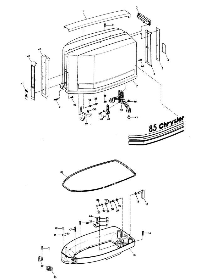 | 1 | Art.: TRIM, TOP Деталей в узле: 1 снято с производства 2 | Art.: PAN HD SCREW, 10 - 24 X 9/16 Деталей в узле: 10 3 | Art.: ручка наклона Деталей в узле: 1 снято с производства 4 | Art.: FA407528 INSERT, PLATE REAR Деталей в узле: 1 снято с производства 5 | Art.: F438386 PLATE, REAR Деталей в узле: 1 снято с производства 6 | Art.: TRIM, REAR Деталей в узле: 1 снято с производства 7 | Art.: -A480944 ENGINE COVER W/RETAINER, SCREWS AND NUTS Деталей в узле: 1 8 | Art.: F498397 DECAL STRIPE, LOWER Деталей в узле: 2 снято с производства 9 | Art.: F498392 DECAL, "CHRYSLER" Деталей в узле: 2 снято с производства 10 | Art.: F407386 DECAL, NUMERAL 85 Деталей в узле: 2 снято с производства 11 | Art.: F498396 DECAL, STRIPE UPPER Деталей в узле: 2 снято с производства 12 | Art.: FA481469 ENGINE COVER LATCH HANDLE W/SHAFT Деталей в узле: 1 снято с производства 13 | BEARING, LATCH SHAFT Деталей в узле: 2 14 | Art.: HEX CAP SCREW, 1/4 - 20 X 3/4 Деталей в узле: 6 цена по запросу 15 | Art.: F480038-2 SUPPORT PLATE Деталей в узле: 1 снято с производства 16 | Art.: BUSHING, ELECTRIC CABLE Деталей в узле: 1 цена по запросу 17 | Art.: F311189-1 BUSHING, CABLE ENTRY Деталей в узле: 1 снято с производства 18 | Art.: FA77395-5 IDENTIFICATION PLATE W/SCREWS FOR U.S.A. MODELS Деталей в узле: 1 снято с производства 19 | Art.: ROUND HD SCREW, 2 X 3/16 Деталей в узле: 2 цена по запросу 20 | Art.: HEX SLOT HD SCREW, 1/4 - 20 X 5/8 Деталей в узле: 5 цена по запросу 21 | Art.: DEFLECTION STOP Деталей в узле: 1 цена по запросу 22 | Art.: SPRING LOCKWASHER Деталей в узле: 4 цена по запросу 23 | Art.: HEX CAP SCREW, 5/16 - 18 X 5/8 Деталей в узле: 2 цена по запросу 24 | Art.: F1858 HEX CAP SCREW, 5/16 - 18 X 1 Деталей в узле: 2 снято с производства 25 | Art.: HEX CAP SCREW, 1/4 - 20 X 5/8 Деталей в узле: 1 цена по запросу 26 | Art.: SPRING LOCKWASHER Деталей в узле: 1 цена по запросу 27 | Art.: PLAIN WASHER Деталей в узле: 1 цена по запросу