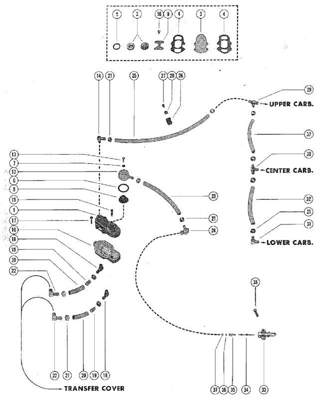 | 1 | Art.: 66530A2 Топливный насос в сборе Деталей в узле: 1 снято с производства 2 | Art.: 21-30430A7 обратный клапан в сборе Деталей в узле: 1 3 | Art.: Диафрагма в сборе Деталей в узле: 1 4 | Art.: - GASKET, DIAPHRAGM Деталей в узле: 2 5 | Art.: - прокладка обратного клапана Деталей в узле: 2 6 | Art.: - Уплотнительное кольцо между крышкой и корпусом Деталей в узле: 1 7 | Art.: - GASKET, NYLON - FILTER COVER SCREW Деталей в узле: 1 8 | Art.: 35-59072 SCREEN, FILTER - INLET Деталей в узле: 1 9 | Art.: 23004 фиксатор обратного клапана Деталей в узле: 1 снято с производства 10 | Art.: SCREW, RETAINER TO FUEL PUMP (1/4") Деталей в узле: 2 цена по запросу 12 | Art.: крышка топливного впуска Деталей в узле: 1 снято с производства 13 | Art.: 10-37370 SCREW, COVER TO FUEL PUMP (5/8") Деталей в узле: 1 18 | Art.: FITTING, PULSE LINE (90 DEG.) Деталей в узле: 2 цена по запросу 19 | Art.: 24-68434 SPRING, PULSE LINE Деталей в узле: 2 снято с производства 20 | PULSE LINE (3 1/4") Деталей в узле: 2 цена по запросу 21 | Art.: 54-68424 зажим присоединения топливопровода Деталей в узле: 12 снято с производства 22 | Art.: FITTING, PULSE LINE TO TRANSFER COVER ((90 DEG.))Деталей в узле: 2 цена по запросу 23 | FUEL LINE, ADAPTOR TO FUEL PUMP (6 3/4") Деталей в узле: 1 цена по запросу 24 | Art.: 22-63981 колено от топливопровода к переходнику Деталей в узле: 1 25 | Топливопровод (FUEL PUMP TO UPPER CARBURETOR (15 3/4"))Деталей в узле: 1 цена по запросу 26 | Art.: 54-22627 CLIP, FUEL LINE ATTACHING Деталей в узле: 1 снято с производства 27 | Art.: 10-62568 SCREW, FUEL LINE CLIP (3/8") Деталей в узле: 1 28 | Art.: "D" WASHER, FUEL LINE CLIP SCREW Деталей в узле: 1 29 | Art.: 22-66328 FITTING, TEE - UPPER CARBURETOR Деталей в узле: 1 снято с производства 30 | Art.: Т-образный фиттинг центрального карбюратора Деталей в узле: 1 31 | Art.: угловой фиттинг нижнего карбюратора Деталей в узле: 1 цена по запросу 32 | Топливопровод (CARBURETOR TO CARBURETOR (6 1/4"))Деталей в узле: 2 цена по запросу 33 | Art.: 22833 ADAPTOR, CHECK UNIT (FUEL LINE) Деталей в узле: 1 34 | Art.: 23069 STEM, CHECK UNIT ADAPTOR Деталей в узле: 1 цена по запросу