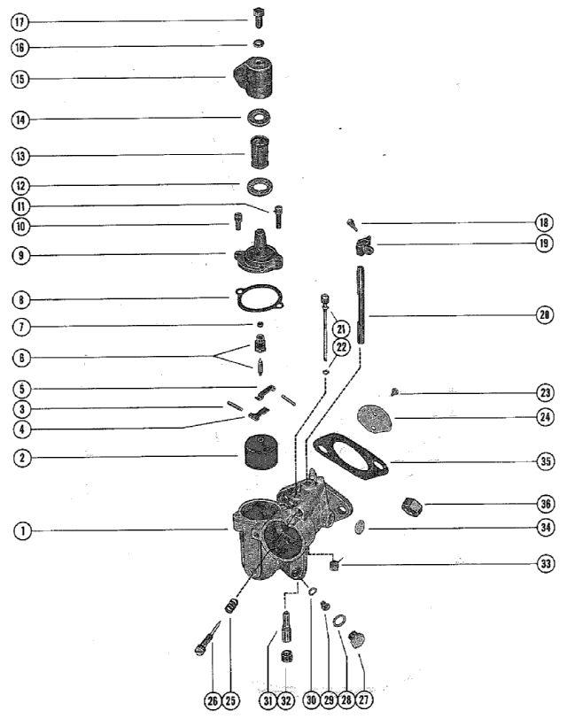 | 1 | Art.: 1335-2475 CARBURETOR ASSEMBLY, COMPLETE (KC-6A) Деталей в узле: 3,3,3 снято с производства 2 | Art.: поплавок в сборе Деталей в узле: 3,3,3 цена по запросу 3 | Art.: 17-20853 PIN, FLOAT LEVER PINON Деталей в узле: 6,6,6 снято с производства 4 | Art.: 1399-102 рычаг поплавка нижний Деталей в узле: 3,3,3 снято с производства 5 | Art.: 1399-101 рычаг поплавка верхний Деталей в узле: 3,3,3 снято с производства 6 | Art.: INSET NEEDLE, SEAT AND GASKET Деталей в узле: 3,3,3 цена по запросу 7 | Art.: 27-25033 Прокладка впускного седла Деталей в узле: 3,3,3 снято с производства 8 | Art.: 1399-99 прокладка крышки поплавковой камеры Деталей в узле: 3,3,3 9 | Art.: 1399-1133 крышка поплавковой камеры Деталей в узле: 3,3,3 10 | Art.: винт крышки поплавковой камеры короткий Деталей в узле: 3,3,3 цена по запросу 11 | Art.: 10-25850 винт поплавковой камеры длинный Деталей в узле: 3,3,3 снято с производства 12 | Art.: 27-25851 прокладка крышки фильтра большая Деталей в узле: 3,3,3 13 | Art.: Экран фильтра Деталей в узле: 3,3,3 цена по запросу 14 | Art.: 27-25849 прокладка крышки фильтра маленькая Деталей в узле: 3,3,3 15 | Art.: крышка фильтра Деталей в узле: 3,3,3 цена по запросу 16 | Art.: 27-25848 прокладка винта крышки фильтра Деталей в узле: 3,3,3 17 | Art.: 10-25822 SCREW, STRAINER COVER FASTENING Деталей в узле: 3,3,3 снято с производства 18 | Art.: винт фиксатора рычага дросселя Деталей в узле: 3,3,3 цена по запросу 19 | Art.: LEVER, THROTTLE STOP (SEE NOTE BELOW) Деталей в узле: 3,3,3 снято с производства 20 | Art.: 1399-2012 Вал дросселя Деталей в узле: 3,3,3 снято с производства 21 | Art.: 1399-2555 TUBE, IDLE Деталей в узле: 3,3,3 снято с производства 22 | Art.: 27-23180 GASKET, IDLE TUBE Деталей в узле: 3,3,3 снято с производства 23 | Art.: 10-23035 винт и стопорная шайба заслонки дросселя Деталей в узле: 6,6,6 снято с производства 24 | Art.: 1399-2014 дроссельная заслонка Деталей в узле: 3,3,3 снято с производства 25 | Art.: 24-27160 пружина винта регулировки холостого хода Деталей в узле: 3,3,3 26 | Art.: 1399-1713 винт регулировки холостого хода Деталей в узле: 3,3,3 снято с производства 27 | Art.: 10-28405 винт пробки канала главного топливного жиклера Деталей в узле: 3,3,3 снято с производства 28 | Art.: 27-28406 прокладка винта пробки канала жиклера Деталей в узле: 3,3,3 снято с производства 29 | Art.: 1399-1653 главный топливный жиклер (.053) Деталей в узле: OPT,OPT,OP снято с производства 29 | Art.: 1399-1651 JET, MAIN FUEL (.051) - STANDARD Деталей в узле: 3,3,3 снято с производства 29 | Art.: 1399-1649 JET, MAIN FUEL (.049) Деталей в узле: OPT,OPT,OP снято с производства 29 | Art.: 1399-1767 главный топливный жиклер (.047) Деталей в узле: OPT,OPT,OP снято с производства 30 | Art.: 27-28409 прокладка главного топливного жиклера Деталей в узле: 3,3,3 снято с производства 31 | Art.: 1399-2535 главный распылитель Деталей в узле: 3,3,3 снято с производства 32 | Art.: 10-28846 винт пробки главного распылителя Деталей в узле: 3,3,3 снято с производства 33 | Art.: 24-26890 SPRING, THROTTLE SHAFT RETURN (CTR&LOWER CARBURETOR) Деталей в узле: 2,2,2 |