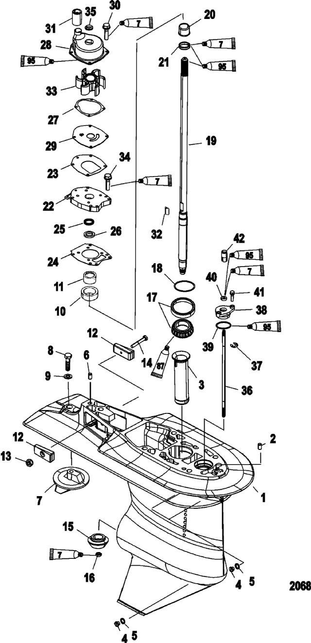 | 1 | Art.: 1600-888845T Корпус редуктора в сборе Деталей в узле: 1 2 | Art.: передний посадочный штифт с отверстием (0.375 х 0.625) Деталей в узле: 1 3 | Art.: 43046 Масляная трубка Деталей в узле: 1 4 | Art.: комплект сливного винтов (0.375-16 x 0.250) Деталей в узле: 3 5 | Art.: 12-191833 Уплотнение Деталей в узле: 3 6 | Art.: 17-43044 задний посадочный штифт без отверстия (0.375 x 0.625) Деталей в узле: 1 7 | Art.: триммер Деталей в узле: 1 8 | Art.: 10-825427 винт (0.437-14 x 1.250), нержавеющая сталь Деталей в узле: 1 9 | Art.: 12-451761 WASHER, (.453 x .812 x .105) Black Oxide Деталей в узле: 1 10 | Art.: 43040T1 опора в сборе Деталей в узле: 1 11 | Art.: -NSS Не продается по отдельности, игольчатый подшипник Деталей в узле: 1 12 | Art.: 826134Q анод Деталей в узле: 2 13 | Art.: 11-401386 Гайка (М6), нержавеющая сталь Деталей в узле: 1 14 | Art.: 10-4000333 Винт (M6 x 40) Деталей в узле: 1 15 | Art.: -NSS не продается по отдельности, ведущая шестерня - часть комплекта шестерен переднего хода Деталей в узле: 1 16 | Art.: 11-35921 гайка (0.625-18) Деталей в узле: 1 17 | Art.: 31-883047A1 конический роликовый подшипник в сборе Деталей в узле: 1 18 | Art.: 15-44492A1 набор регулировочных прокладок Деталей в узле: 1 снято с производства 19 | Art.: 45-897680T01 Вертикальный вал в сборе, X-Long Деталей в узле: 1 19 | Art.: 45-897679T01 вертикальный вал в сборе, Long Деталей в узле: 1 20 | Art.: 42461A1 втулка / комплект колец Деталей в узле: 1 21 | Art.: -NSS не продается по отдельности, уплотнительное кольцо Деталей в узле: 1 22 | Art.: 43055A4 крышка водяного насоса в сборе Деталей в узле: 1 снято с производства 23 | Art.: 27-430331 Прокладка Деталей в узле: 1 24 | Art.: Прокладка Деталей в узле: 1 25 | Art.: 26-43036 Сальник нижний Деталей в узле: 1 26 | Art.: 26-43035 сальник верхний Деталей в узле: 1 27 | Art.: 27-8172771 Прокладка Деталей в узле: 1 28 | Art.: 817275A2 комплект корпуса, верхняя часть водяного насоса Деталей в узле: 1 29 | Art.: Пластина основания Деталей в узле: 1 30 | Art.: 10-82684430 Винт (М6 х 30) Деталей в узле: 4 31 | Art.: 430232 Уплотнение Деталей в узле: 1 32 | Art.: шпонка Деталей в узле: 1 цена по запросу