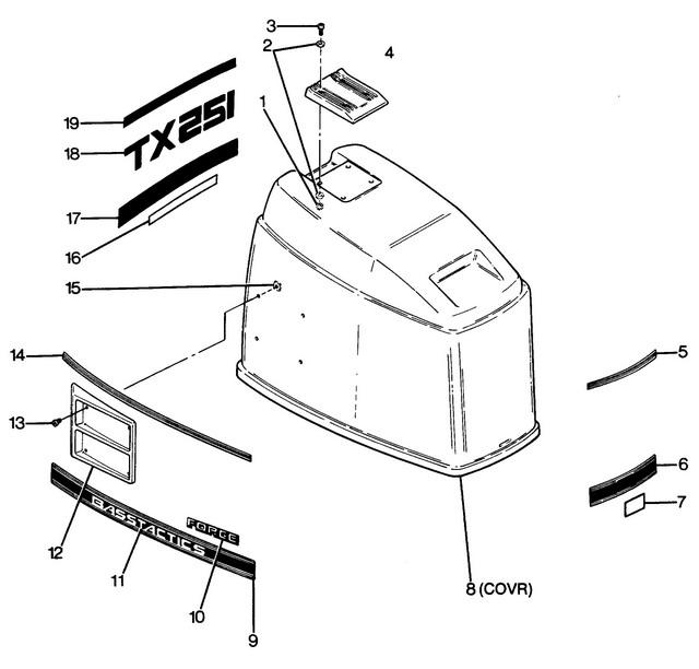 | 1 | Art.: STOP NUT, 1/4 - 20 Деталей в узле: 4 цена по запросу 2 | Art.: шайба Деталей в узле: 8 цена по запросу 3 | Art.: F2143 HEX SOC. HD. SCREW, 1/4 - 20 X 1 S.S. Деталей в узле: 4 4 | HANDLE, TILT Деталей в узле: 1 снято с производства 5 | Art.: FM685894 DECAL, TOP-FRONT Деталей в узле: 1 снято с производства 6 | Art.: FM685892 DECAL, BOTTOM-FRONT Деталей в узле: 1 снято с производства 7 | Art.: DECAL, "US MARINE" Деталей в узле: 1 цена по запросу 8 | ENGINE COVER, (WITHOUT PAINT, DECALS, OR HARDWARE) Деталей в узле: 1 цена по запросу 9 | Art.: FM685396 DECAL, BOTTOM-STARBOARD Деталей в узле: 1 снято с производства 10 | Art.: MEDALLION-FORCE Деталей в узле: 2 цена по запросу 11 | Art.: FM685392 DECAL, "BASSTACTICS" (SIDE) Деталей в узле: 2 снято с производства 12 | Art.: F685681 SCOOP, AIR Деталей в узле: 2 снято с производства 13 | Art.: F2216 HEX SOC. HD. SCREW, 8-32 X 1/2 S.S. Деталей в узле: 8 снято с производства 14 | Art.: FM685915 DECAL, TOP-SIDE Деталей в узле: 2 снято с производства 15 | Art.: F1693 TINNERMAN NUT, 8-32 Деталей в узле: 8 |