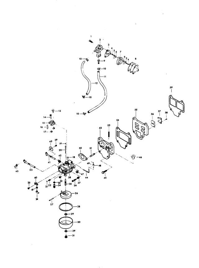 8 | Art.: 27-818043A1 FUEL PUMP DIAPHRAGM W/GASKET Деталей в узле: 1 9 | Art.: F901811 FUEL PUMP FILTER Деталей в узле: 1 10 | Art.: HOSE CLAMP Деталей в узле: 4 снято с производства 11 | Art.: Топливопровод Деталей в узле: 1 цена по запросу 12 | Art.: FUEL LINE W/CLAMPS Деталей в узле: 1 цена по запросу 13 | Art.: F1912 HEX HD SCREW, 10 - 24 X 1/2 Деталей в узле: 1 снято с производства 14 | Art.: F1834 FILL HD SCREW, 10 - 24 X 7/8 Деталей в узле: 1 снято с производства 15 | Art.: 817754A1 ARM, CARBURETOR FOLLOWER Деталей в узле: 1 снято с производства 16 | Art.: F66193 приводная штанга дросселя Деталей в узле: 1 снято с производства 17 | Art.: F1365 SQUARE NUT, 10 - 24 Деталей в узле: 2 снято с производства 18 | Art.: BODY CHANNEL WELCH PLUG Деталей в узле: 1 цена по запросу 19 | Art.: FO10588 BODY CHANNEL CUP PLUG Деталей в узле: 1 20 | Art.: FO16120 BYPASS TUBE Деталей в узле: 1 снято с производства 21 | Art.: FO4784 CHOKE FRICTION BALL Деталей в узле: 1 снято с производства 22 | Art.: FO8805 CHOKE FRICTION SPRING Деталей в узле: 1 снято с производства 23 | Art.: FO17362 вал воздушной заслонки и рычаг Деталей в узле: 1 снято с производства 24 | Art.: FO15367 воздушная заслонка Деталей в узле: 1 снято с производства 25 | Art.: CHOKE SHUTTER RETAINING SCREW AND LOCKWASHER Деталей в узле: 1 26 | Art.: поплавок Деталей в узле: 1 27 | Art.: FO13944 FLOAT LEVER PIN Деталей в узле: 1 28 | Art.: FO15623 FUEL BOWL GASKET Деталей в узле: 1 29 | Art.: FO2510 FUEL BOWL RETAINING SCREW GASKET Деталей в узле: 2 30 | Art.: FO15366 камера топливной смеси Деталей в узле: 1 31 | Art.: FUEL BOWL RETAINING SCREW Деталей в узле: 1 цена по запросу 32 | Art.: FO13630 MAIN FUEL JET (.033) Деталей в узле: 1 снято с производства 33 | Art.: FO10165 INLET SEAT GASKET Деталей в узле: 1 снято с производства 34 | Art.: FO10790 впускная игла, седло и прокладка Деталей в узле: 1 снято с производства 35 | Art.: FO15722 главный распылитель Деталей в узле: 1 снято с производства 36 | Art.: FO15520 винт регулировки качества смеси на холостом ходу Деталей в узле: 1 37 | Art.: IDLE MIXTURE SCREW SPRING Деталей в узле: 1 цена по запросу 39 | THROTTLE SHUTTER RETAINING SCREW AND LOCKWASHER Деталей в узле: 1 40 | Art.: FO8502 заслонка дросселя Деталей в узле: 1 снято с производства 41 | Art.: FO15718 THROTTLE SHAFT AND LEVER Деталей в узле: 1 снято с производства 42 | Art.: FO15526 THROTTLE SHAFT RETURN SPRING Деталей в узле: 1 снято с производства 43 | Art.: RETAINER, CHOKE ROD Деталей в узле: 1 снято с производства 44 | Art.: THROTTLE CAM FOLLOWER Деталей в узле: 1 снято с производства 45 | Art.: F1914 HEX HD SCREW, 1/4 - 20 X 3/4 Деталей в узле: 4 снято с производства 46 | Art.: F487435 PULLEY STARTER ROPE Деталей в узле: 1 снято с производства 47 | Art.: HEX NUT, 1/4 - 20 Деталей в узле: 2 цена по запросу 48 | Art.: -318318 ROLLER, THROTTLE CAM FOLLOWER Деталей в узле: 1 49 | Art.: F78410 фиксатор Деталей в узле: 1 снято с производства 50 | Art.: F18906 CARBURETOR GASKET Деталей в узле: 1 51 | Art.: Шпилька карбюратора Деталей в узле: 2 снято с производства 52 | Art.: -2A341167 MANIFOLD W/STUDS, PULLEY AND SPRING PIN Деталей в узле: 1 53 | Art.: F1876 SPRING PIN Деталей в узле: 1 снято с производства 54 | Art.: F318168 прокладка коллектора Деталей в узле: 1 снято с производства 55 | Art.: FA387158 REED PLATE W/REEDS, STOPS & SCREWS Деталей в узле: 1 снято с производства 56 | Art.: REED Деталей в узле: 2 цена по запросу 57 | Art.: F424161 REED STOP Деталей в узле: 2 снято с производства 58 | ROUND HD SCREW, 6 - 32 X 1/4 Деталей в узле: 4 цена по запросу